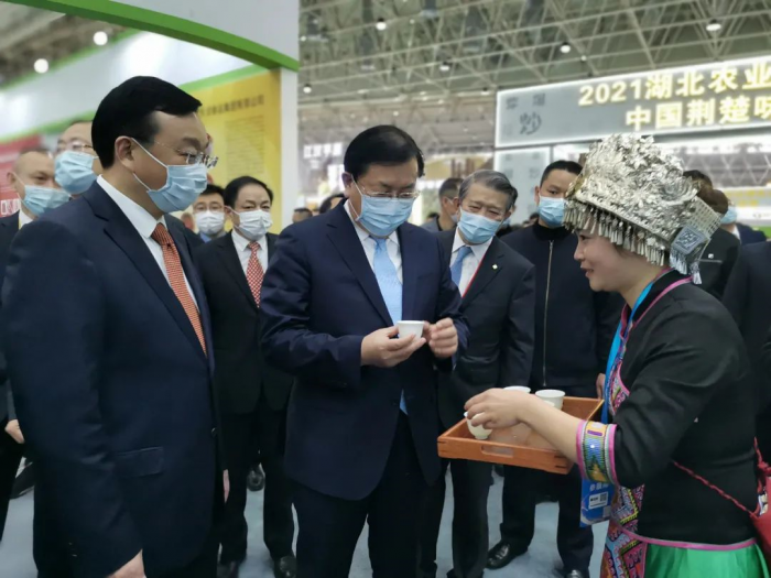 王忠林省长在省农业农村厅厅长吴祖云、楚商联合会会长陈东升的陪同下来到湖北省茶产业链展馆,品尝了厦门邹洪旅游市场营销有限公司恩施玉露。